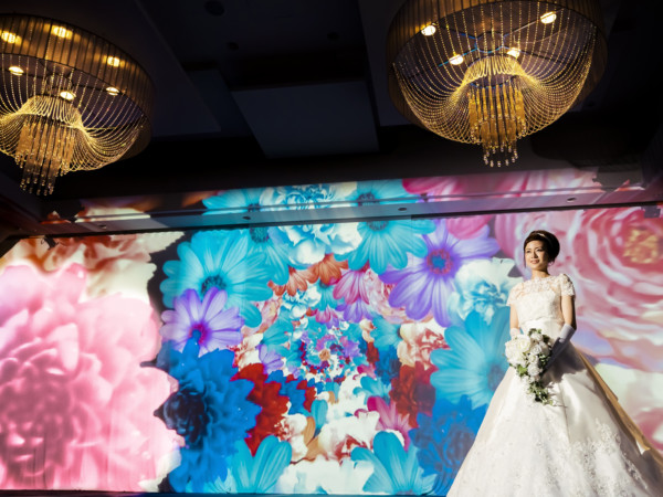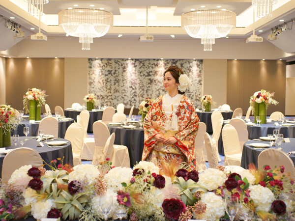 煌めくシャンデリアと和モダンのデザインが目を引くパーティー会場は、和装も洋装も華やかな印象にみせてくれる。