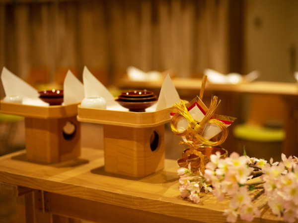 100名参列できる式場では、親族以外のゲストの方々も参列でき、重厚感のある神殿で、伝統的な式を挙げることができます。