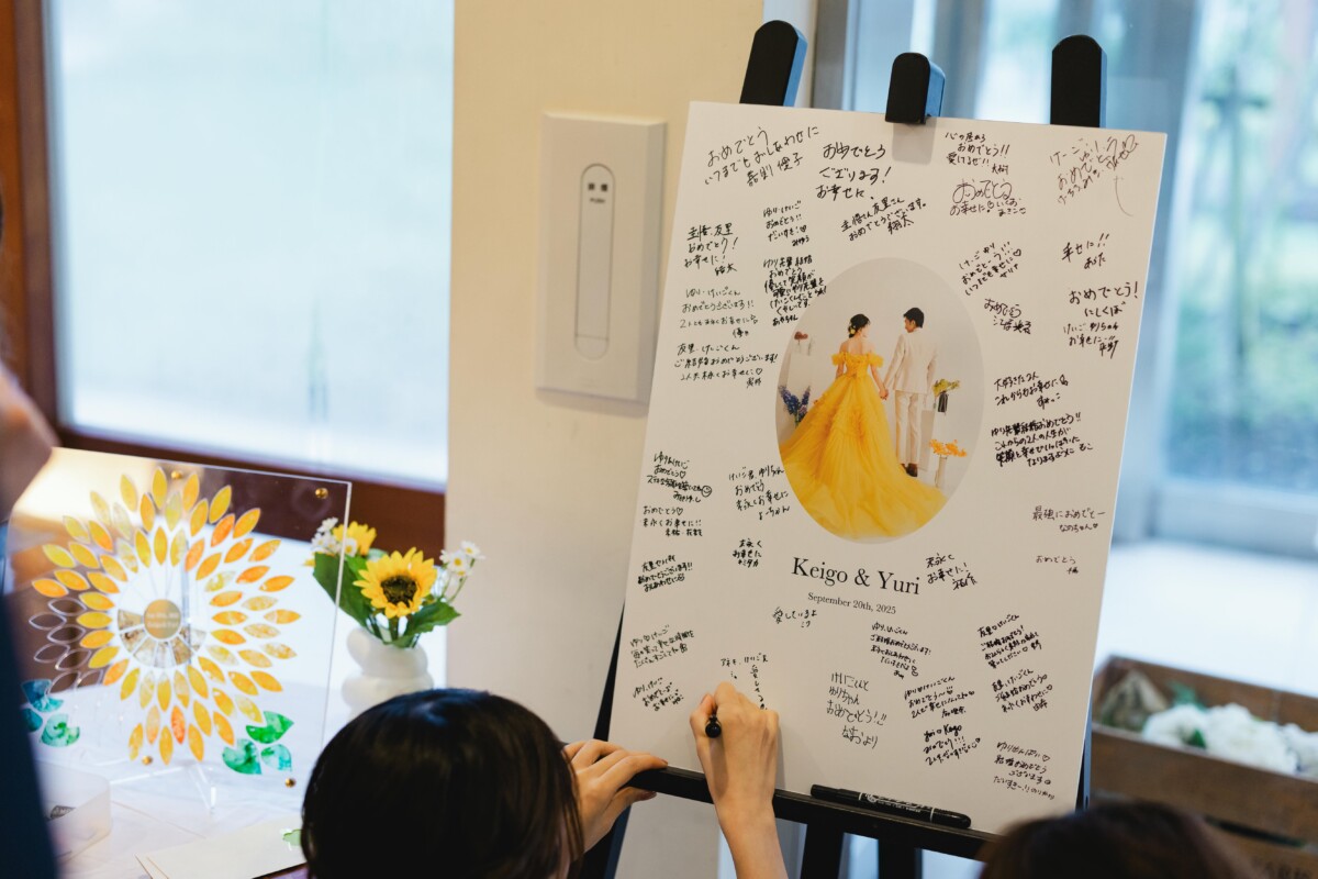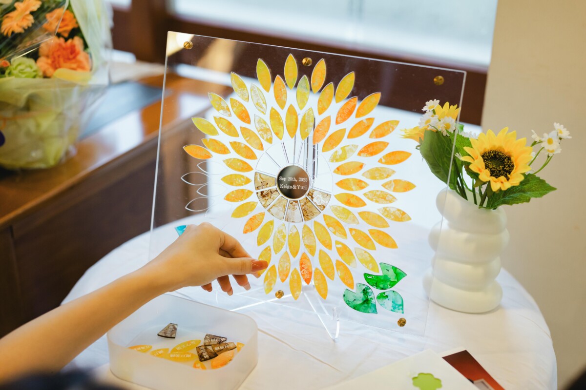 新婦の好きな向日葵を使用して会場を夏っぽくしたところです!