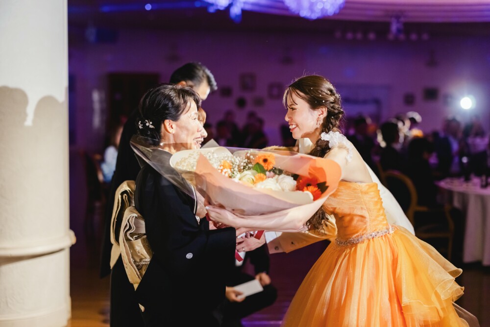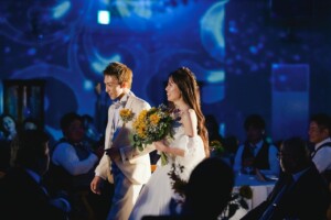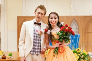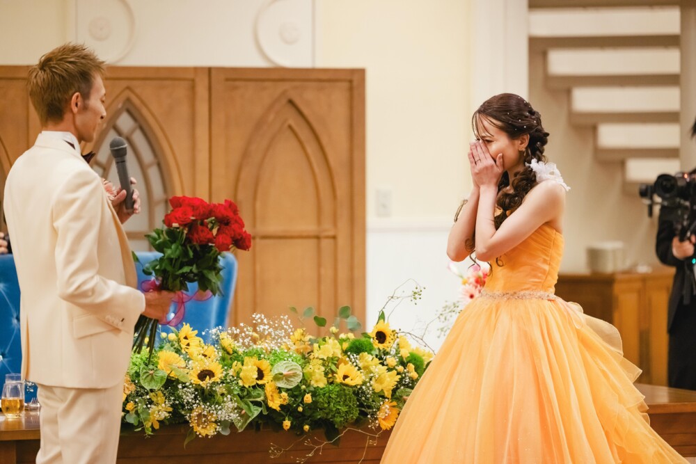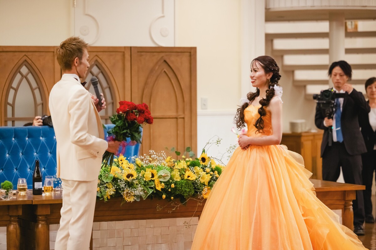 また、披露宴では新婦様にサプライズで新郎様が各テーブルを訪問して1輪のバラの花を集めていただき新婦様に改めてプロポーズを行っていただきました。